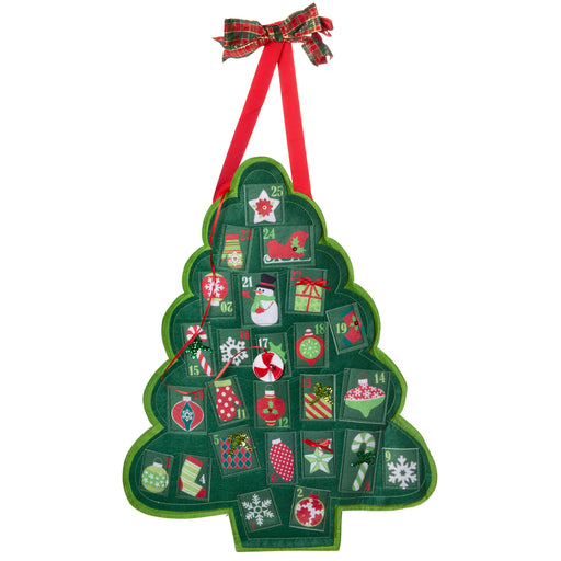 Celebrate the Advent season with this festive calendar. Shaped like a Christmas tree, this hanging door décor features 25 pockets and a movable lol...