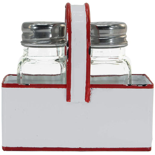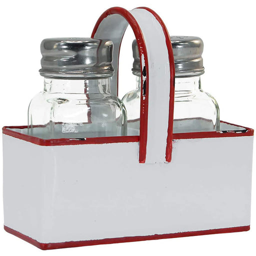 Farmhouse Style Salt and Pepper Shakers and Red Rim Enamel Caddy Set Overall measures 4 1/2 x 4 1/4 x 2 inches Shakers are made of glass with m...