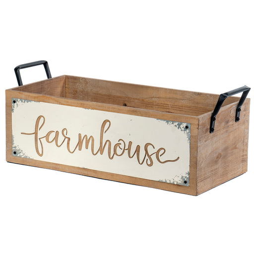 This country rustic reclaimed wood basket features a painted metal sign with a calligraphy cut-out of the word "farmhouse," on the front and back s...