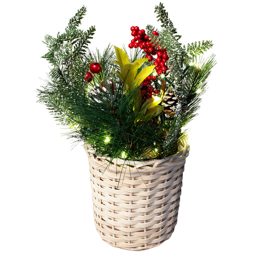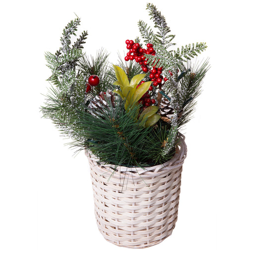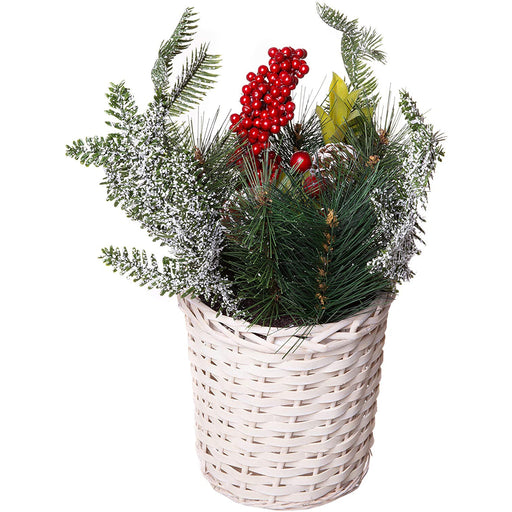 TRADITIONAL LOOK — Natural look embellished by a colored variety of red CRANBERRIES and accompanied by PINE CONES, in a white BASKET. LIFE-LIKE DES...