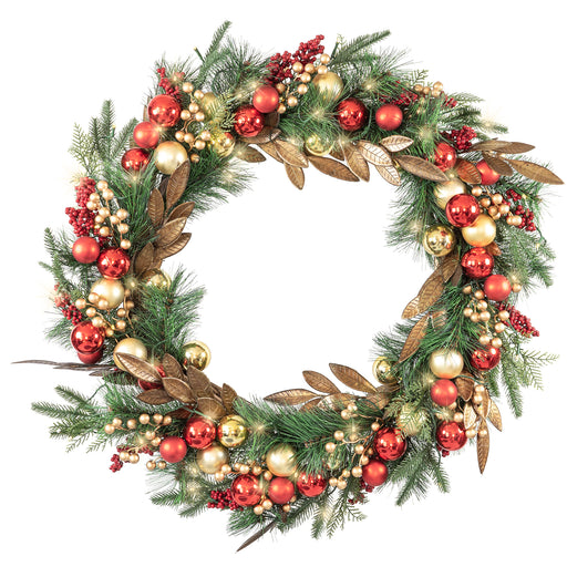 TRADITIONAL LOOK β Natural, thick, and stable grapevine base wreath embellished with bunches of scarlet cranberries, assorted red and gold orname...