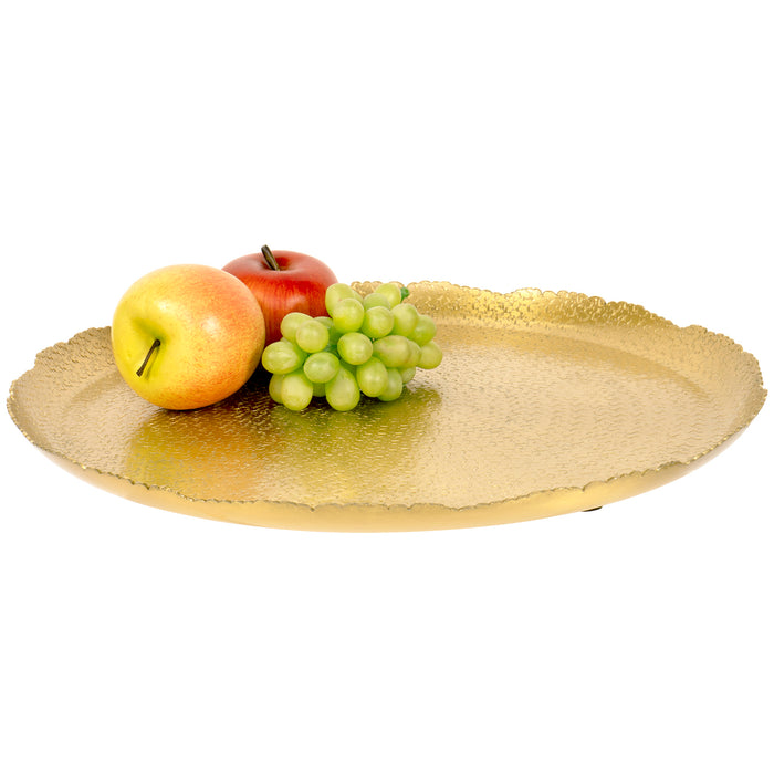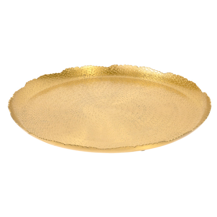 Gold round functional tray ideal for large birthday cakes. Perfect on a dresser in a bedroom, kitchen, dining room, guest room or any other place in your home. Use as a beautiful serving tray for your favorite desserts, cupcakes, and appetizers at your dinner party or use it as a vanity tray to organize your makeup, perfume, and nail polish set. Perfect for displaying, decorating, organizing, storing, and serving a variety of items. This tray makes a great wedding, birthday or housewarming gift. Measures approximately 16 inches round.