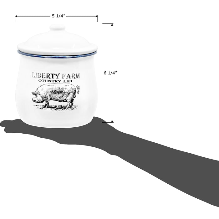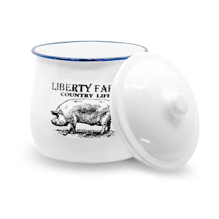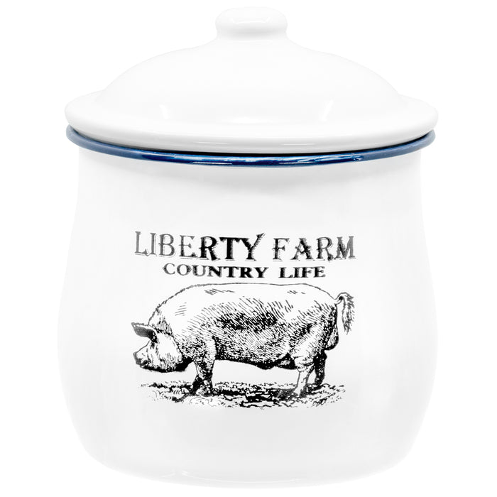 - Features a rounded shape in snow-white finish with Liberty Farm Country Life logo and navy-blue rim. Item is made of durable and solid metal and includes a lid. Not food-safe.