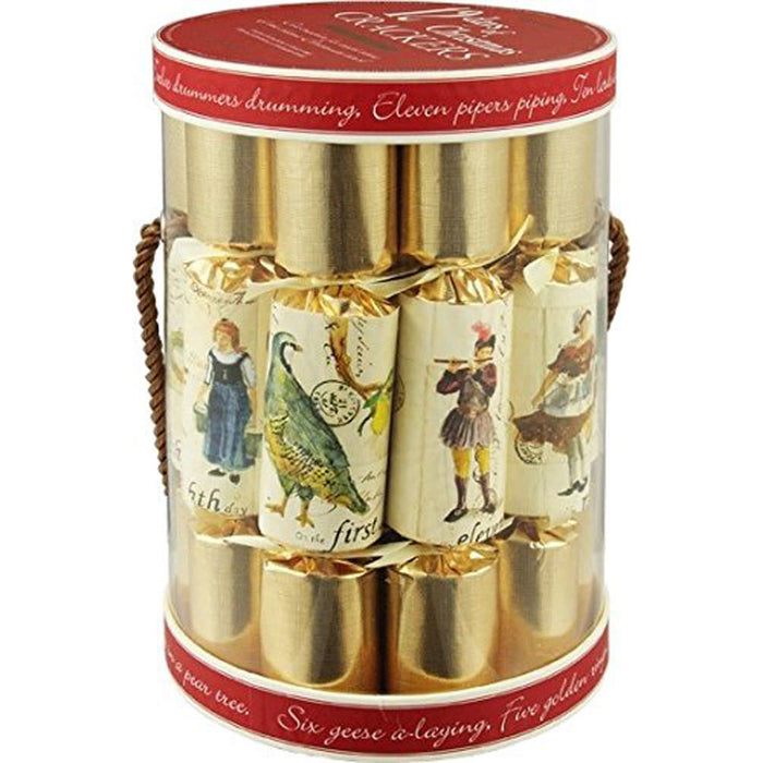 12 beautiful parchment and gold crackers, each depicting one of the 12 Days of Christmas.